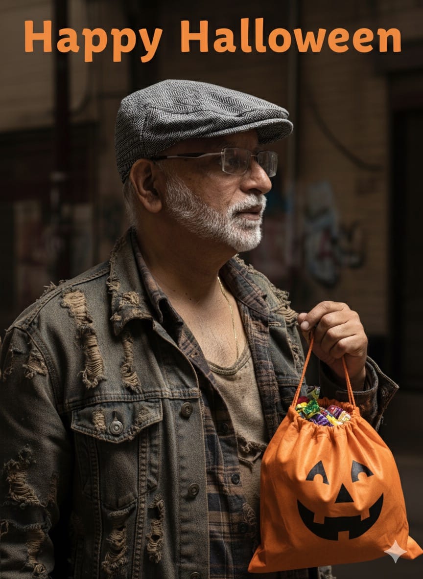 Wish you all a belated happy Halloween. Very few people came to our house, and as a result, there's a lot of candy remaining. This AI image is based on a photo of me wearing a tweed "newsboy cap" I bought from Amazon for $20.