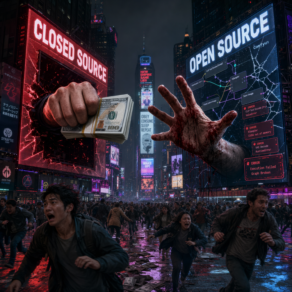 Sometimes I try to combine the previous day's challenge into the next day as a continuation of the theme. Here I was able to combine the screens along with people running away from AI, to make a music video short.