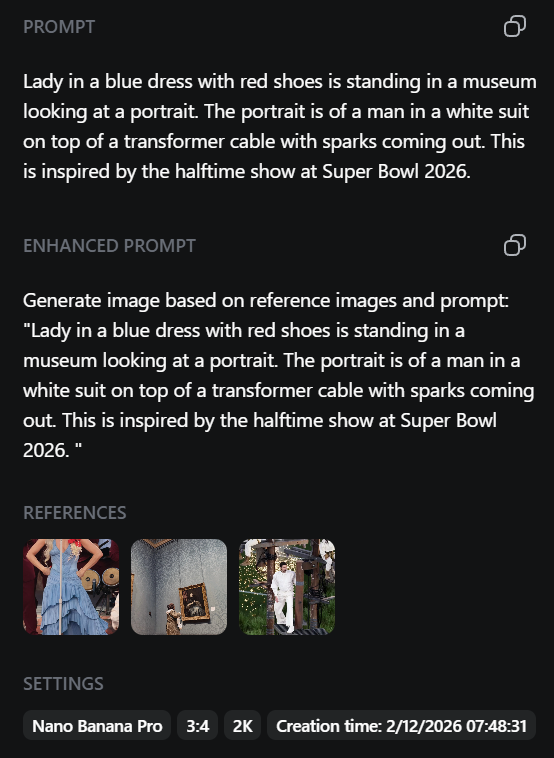 It was inspired by the Super Bowl halftime show where Bad Bunny had climbed up an electric pole, representing in Puerto Rico common people were forced to connect cables together during power outage in storms. I decided to make include Lady Gaga in the Puerto Rican flag color blue dress admiring the portrait in a museum. I made the portrait an animation with sparks using Kling 2.5 model.