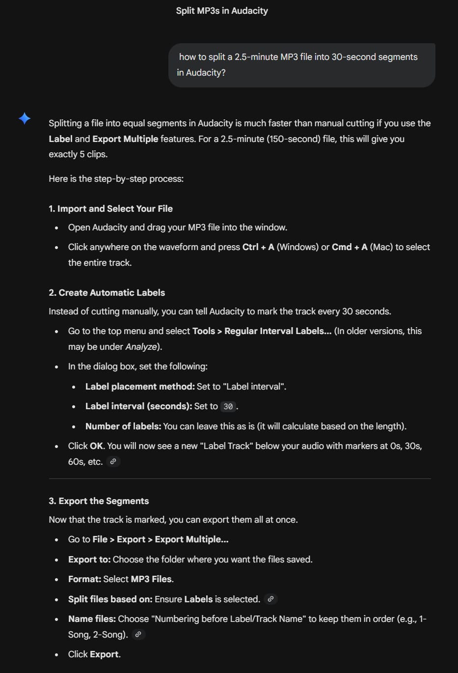 I realized that longer video generations were making my computer extremely sluggish and unresponsive. I decided to break my music into 30-second clips. I used Gemini to teach me how to break up the music mp3 file into 30-second clips via Audacity.