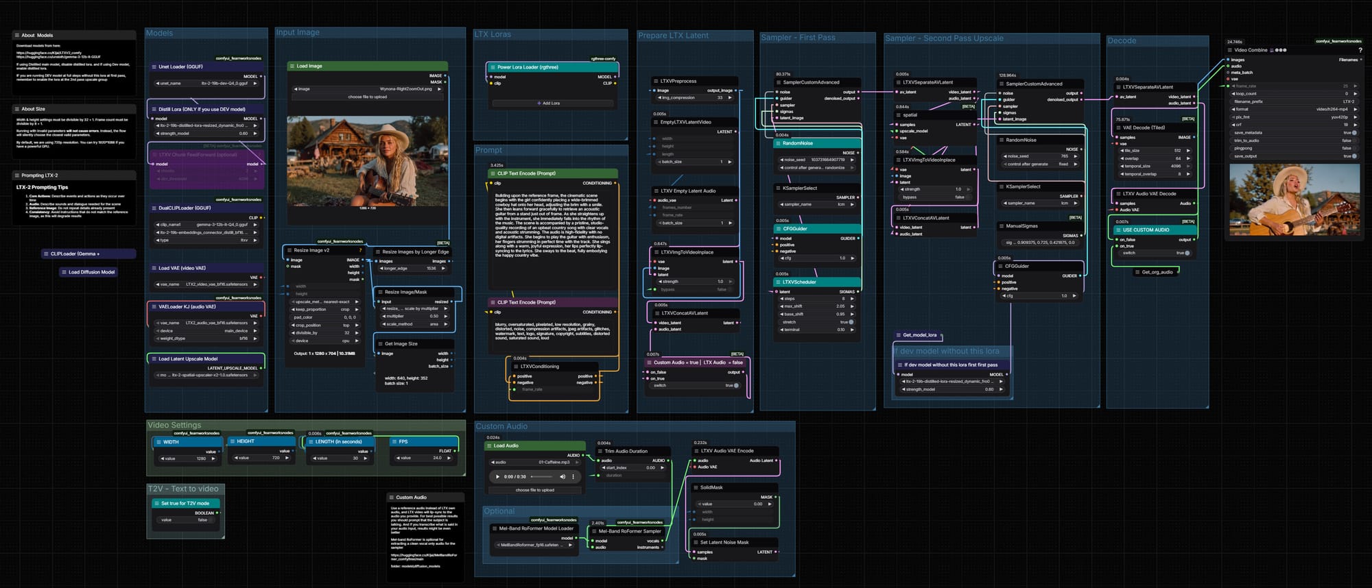 I was getting pretty decent run times, but the text-to-video vocals were not too great. He also shared with me an image-to-video workflow.