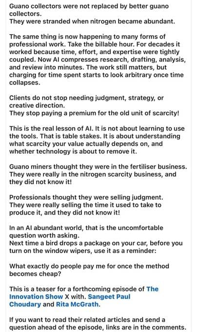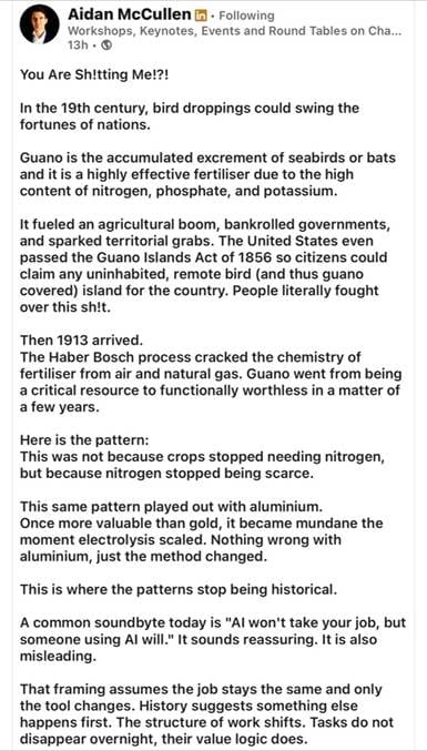 AI art, video, and music mirror the guano collapse described in the screenshots: “This was not because crops stopped needing nitrogen, but because nitrogen stopped being scarce.” Visuals, clips, and songs are still needed everywhere, but AI makes their production abundant. What once required rare skills, expensive tools, and long timelines is now generated in seconds. As a result, creators are not being replaced by “better creators,” just as “guano collectors were not replaced by better guano collectors.” They are stranded because the unit of scarcity vanished. Images, videos, and tracks did not lose usefulness; they lost pricing power.