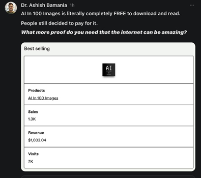 Ioan is an optimist much like Dr. Ashish Bamania. Only one in 7 visitors have paid anything, and they have only paid 80cents on average, on a site where Dr. Bamania’s other ebooks products are priced at $25 or higher https://bamaniaashish.gumroad.com/