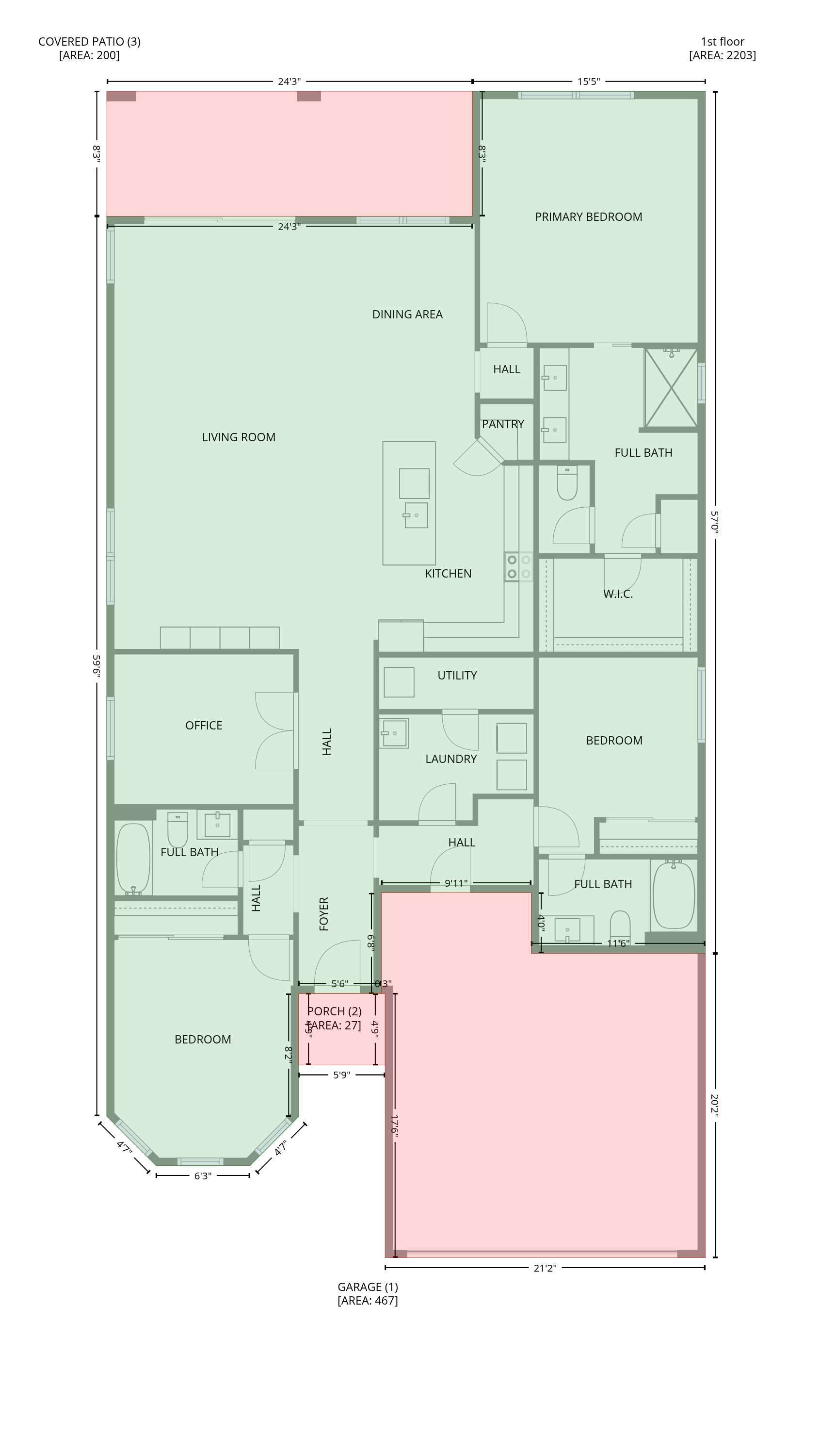 The GLA measurement notes a total SF of 2203 SF, while the builder's site indicates 2,230 square feet, which is 98.8% accuracy. The builder's legal documents incidentally says that their measurements on marketing material are approximate.