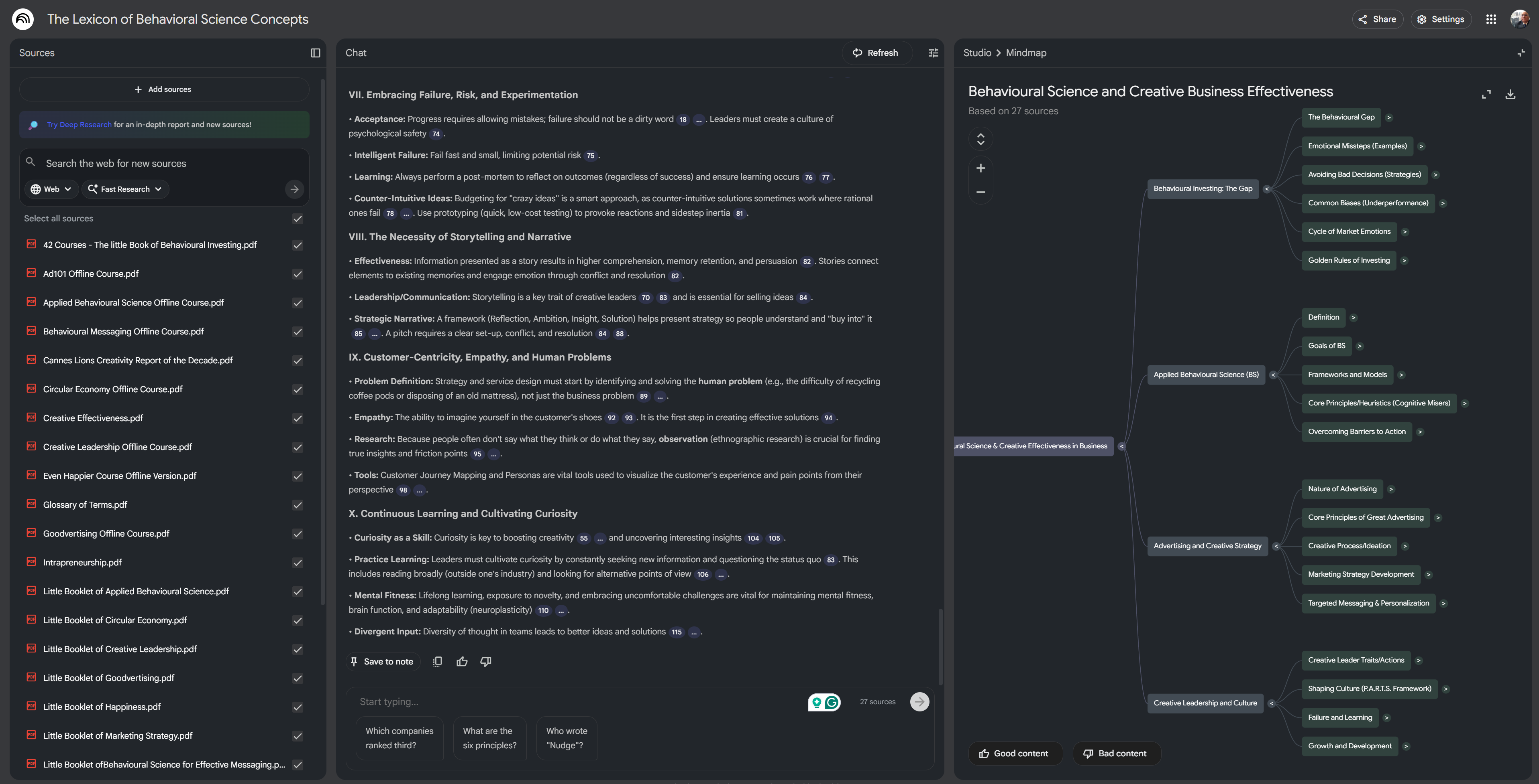 NotebookLM works differently. It's source-grounded, meaning it only references the documents you upload. No random internet facts. No confident-but-wrong answers pulled from training data.