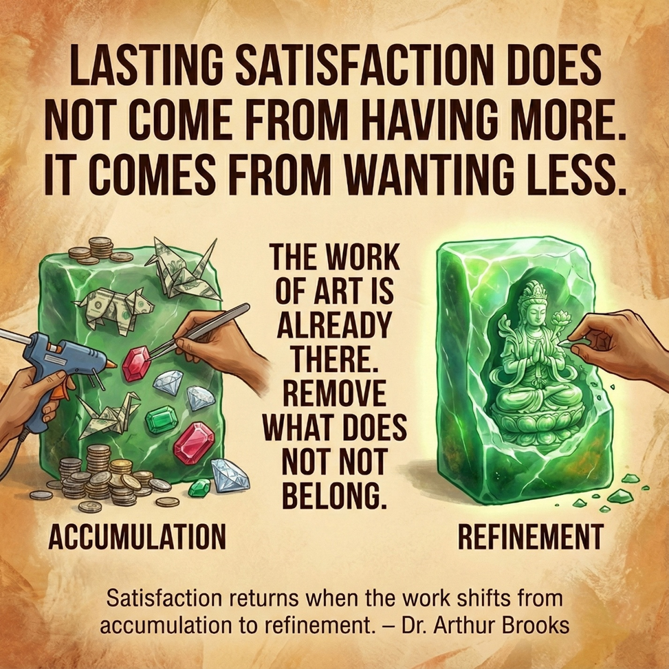 We assume that if we just add more achievements, more recognition, more experiences—eventually the life will feel complete. But I find that way of thinking breaks down, especially in the second half of life. Satisfaction is less like a canvas and more like a block of jade. The work of art is already there; the task is not to add more, but to remove what does not belong. You chip away what is unnecessary, distracting, or driven by ego, and what remains is closer to who you actually are. For many of us, frustration sets in when the canvas is full but life doesn't feel any better. Satisfaction returns only when the work shifts from accumulation to refinement.