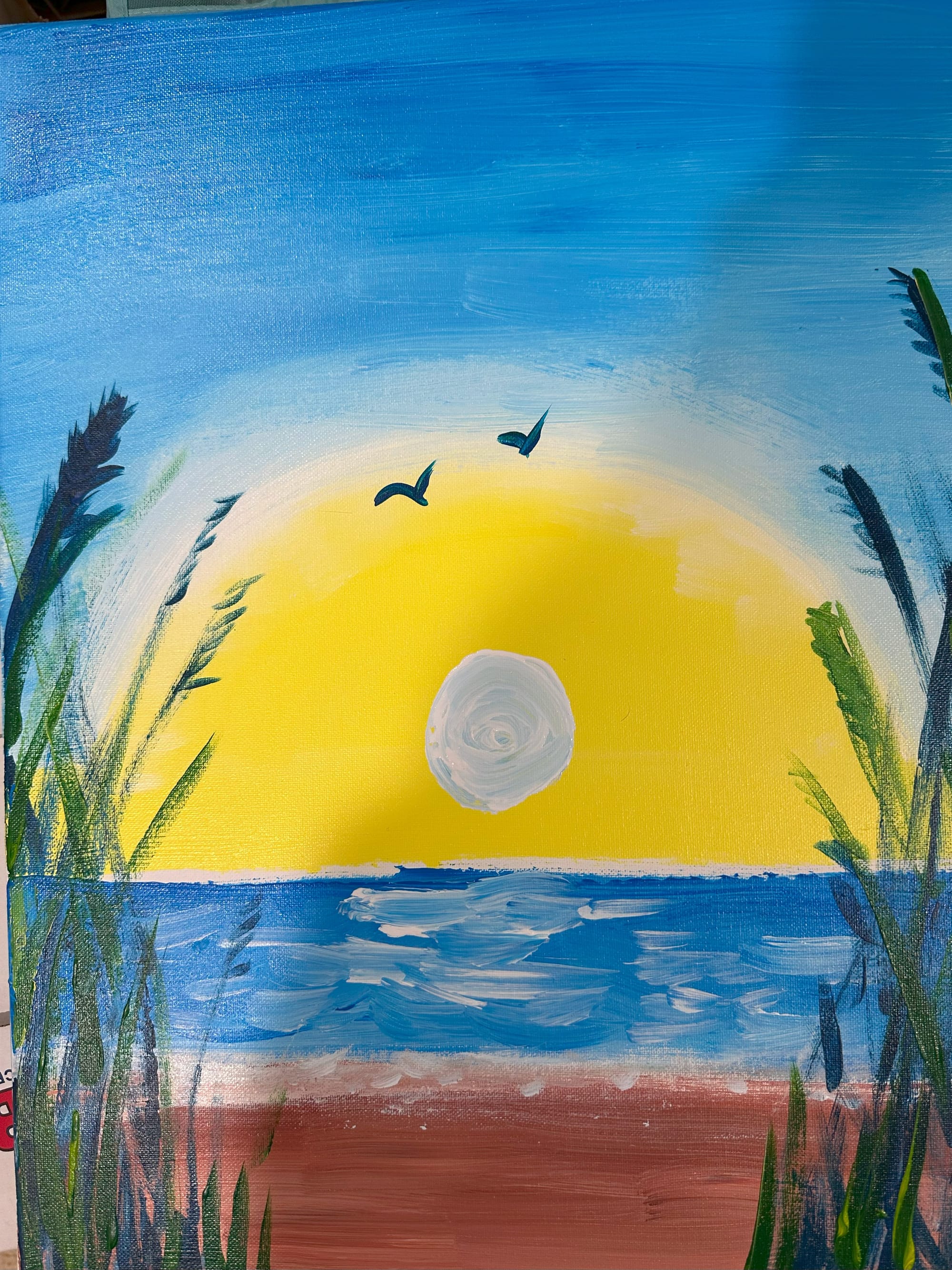 I mistook Acrylic paint for oil paint, and inspired by Impasto techniques, lathered on thick paint onto the canvas! I learned we were supposed to use small portions mixed with water. I wanted the canvas texture to show through in certain areas, such as the grass/reeds, so I swiped the brush quickly. This was my final result: