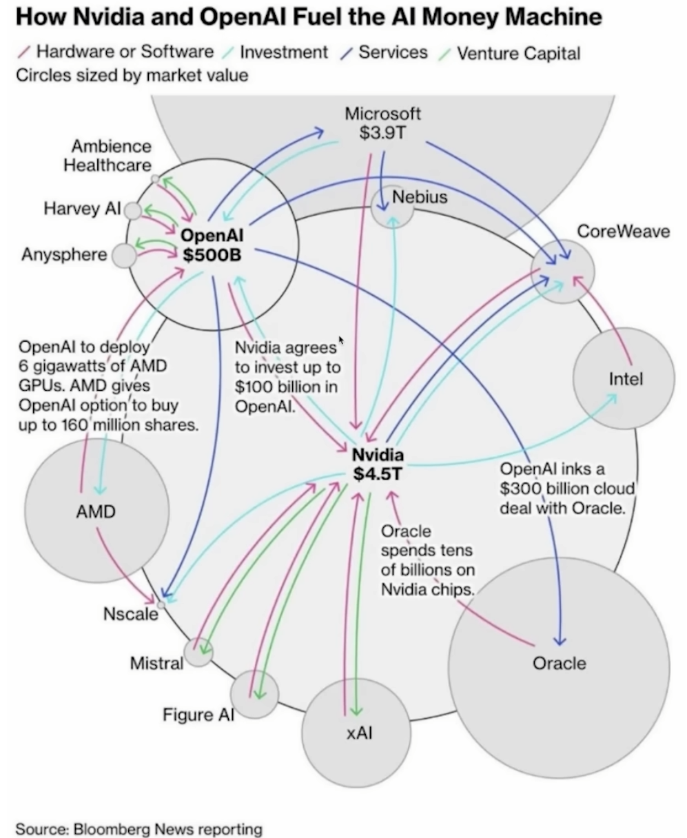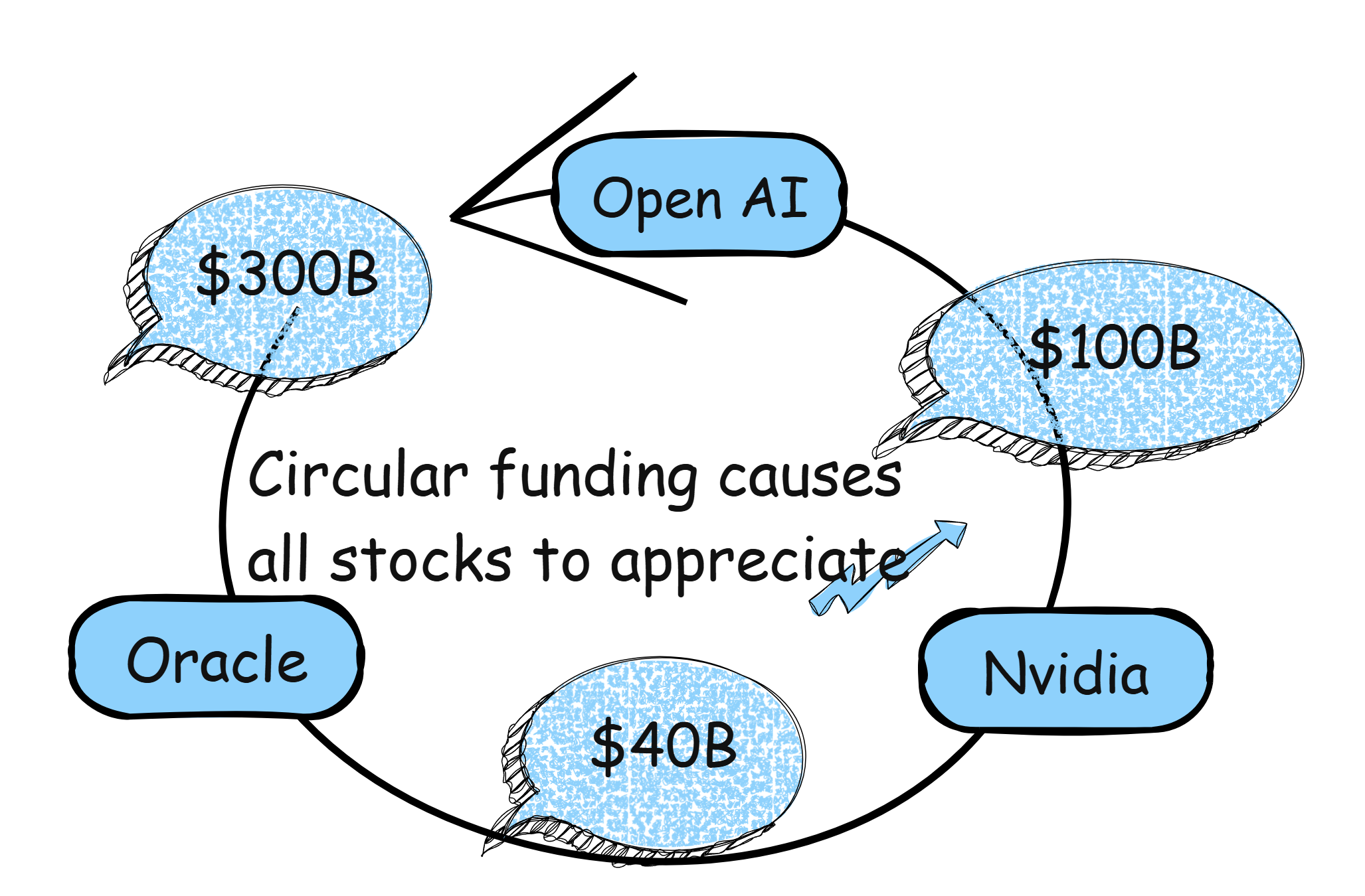 Nvidia invests $100B in OpenAI. OpenAI buys $300B in cloud computing from Oracle. Oracle spends $40B buying Nvidia chips for its data centers.