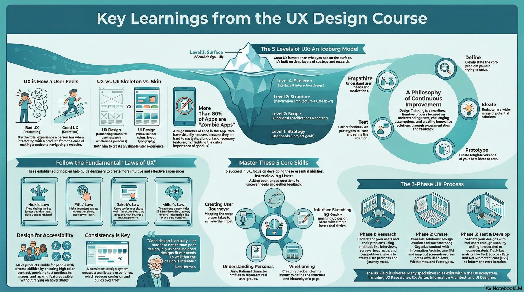 In 2024, I completed a course on UX design from 42 courses. Follow the hyperlink for the course details. The below image has some key learnings from the course.