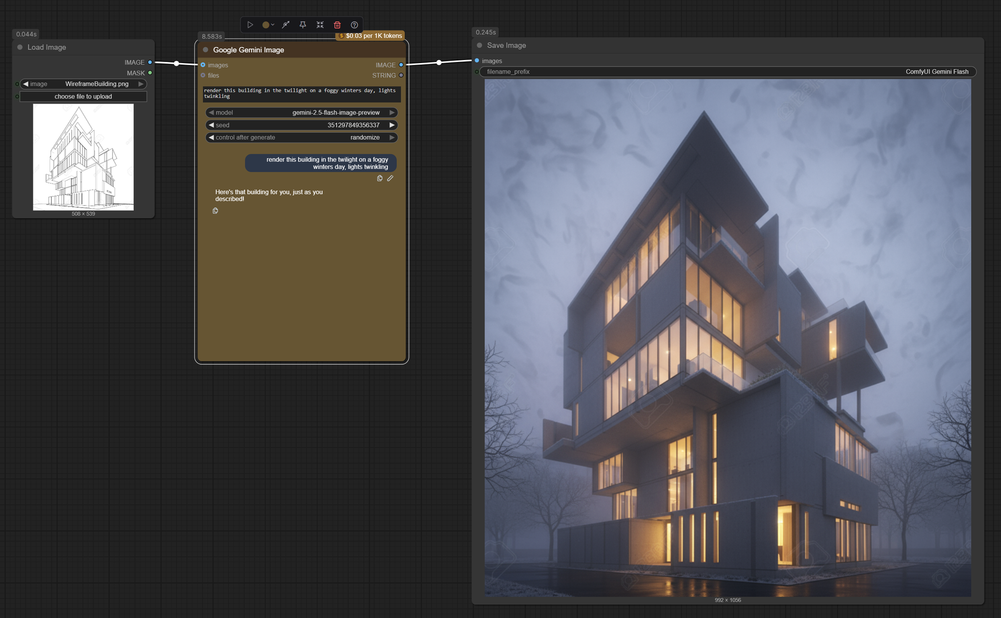 Google 2.5 Flash shines is in architectural visualization. The model demonstrates a sophisticated understanding of the real world that goes beyond simple image generation. Its ability to incorporate geo-coordinates and landmark information into photos suggests a level of spatial and contextual awareness that opens up entirely new possibilities for ArchViz professionals. This isn't just about making pretty pictures – it's about revolutionizing how we communicate architectural ideas.