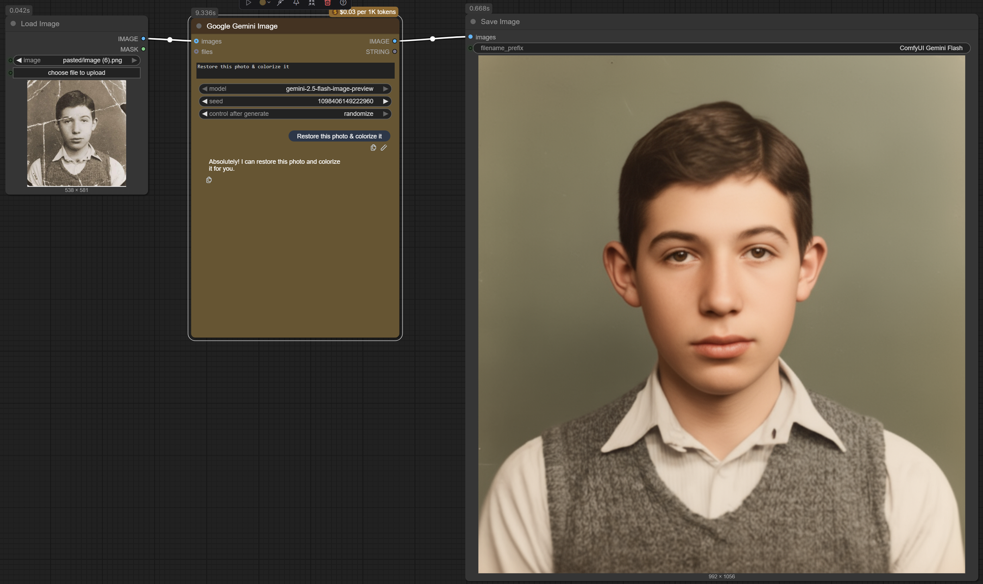 Another exciting aspect of Google 2.5 Flash is its prowess in photo restoration. The model's understanding of photographic principles, as well as its speed and affordability, make it a powerful tool for breathing new life into old or damaged images. The results border on magical when chained with specialized nodes for face enhancement and upscaling.